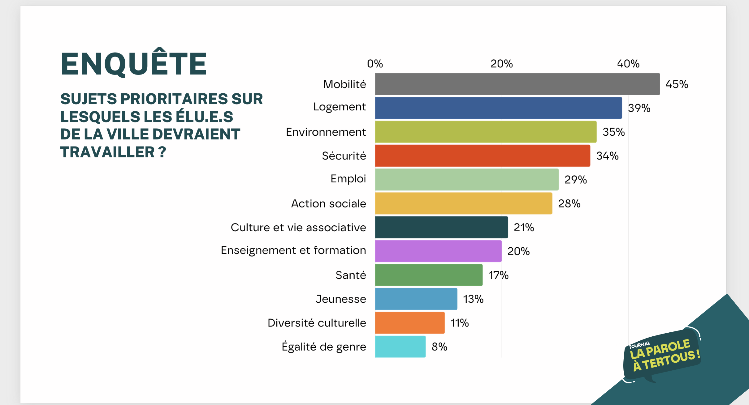 En deuxième place, on retrouve le logement. Parmi les propositions, on trouve ici l'instauration d'une grille de loyers obligatoire, des mesures en faveur de la mixité sociale ou des sanctions " plus systématiques " contre les logements inoccupés. L'environnement et la sécurité arrivent en 3e et 4e position dans les thématiques prioritaires.