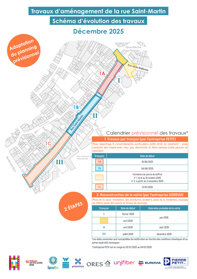 "Les travaux de voirie sont tributaires des travaux des impétrants, ces derniers doivent être achevés dans le tronçon que l'on souhaite reconstruire. Selon les éléments communiqués par les entreprises, les travaux de reconstruction sont prévus dès février 2026 pour le premier tronçon. Le chantier commencera par le haut du tronçon (carrefour avec la rue Massenet) et se poursuivra en direction du beffroi, afin de permettre la reconstruction du parvis du beffroi dès le mois d'avril 2026," détaille la ville de Tournai dans un communiqué.
